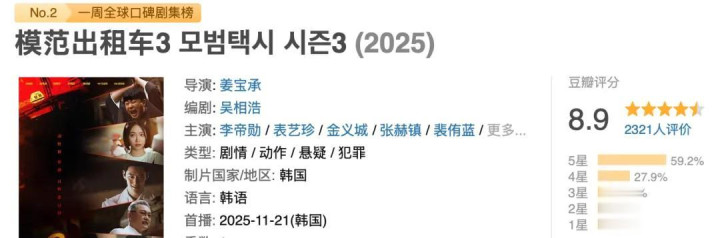 韩国现象级19禁爽剧《模范出租车3》强势回归,一开播就刷新年度收视纪录,豆瓣直冲9分。